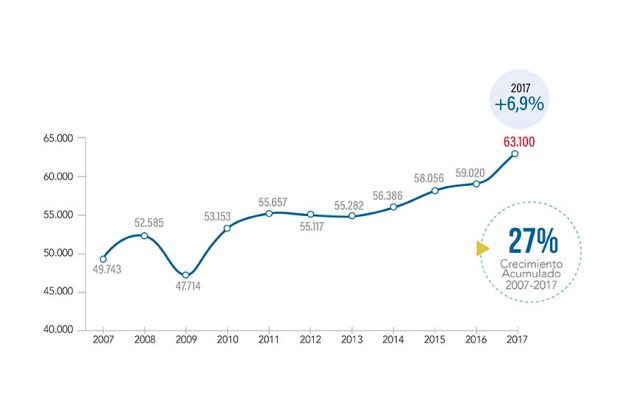 El sector químico facturó un 7% más en 2017 hasta los 63.100 millones, acumulando un crecimiento del 27% en la última década